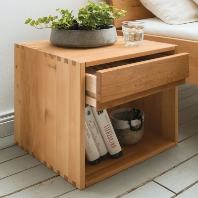 Het kubusvormige design van " Nochero" is de geslaagde mix van discrete onopvallendheid en klassieke elegantie. Het greeploze ontwerp laat het massieve beukenhout, beuken kernhout, elzenhout, wild eikenhout, zwart walnotenhout of Swiss stone pine hout mooi tot zijn recht komen. Het nieuwe onderkomen voor uw leeslamp, wekker & co. is verkrijgbaar met één, twee, drie of vier lades.