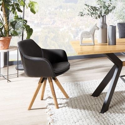 U en uw gasten zullen lang willen blijven zitten op deze gezellige bowl chair. Leg uw armen comfortabel op de armleuningen van de stoel en breng gezellige uren door met familie en vrienden. De gezellige zitkuip is ergonomisch gevormd voor een uiterst comfortabele zit. Het driepootframe is ontworpen om als standaard te worden gebruikt. Het onderstel van massief beuken-, eiken- of notenhout is verkrijgbaar in een vaste versie of met een draaimechanisme. Dankzij het draaimechanisme kunt u opstaan zonder de fauteuil te hoeven verplaatsen en dankzij de geĆ ntegreerde terugdraaifunctie draait de fauteuil zichzelf altijd terug in de oorspronkelijke positie. De comfortabele eetkamerstoel is bekleed met elegant echt leer en heeft een spannende contrasterende stiksels.
