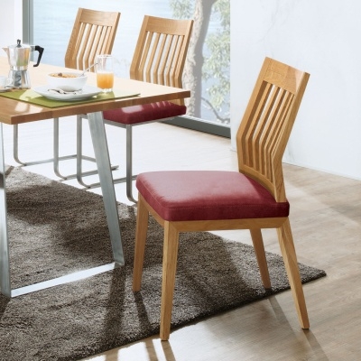 De massief houten stoel " Vuelo" is een lust voor het oog in elke eetkamer. Zijn ergonomisch optimaal gebogen rugleuning met de hoogwaardige massief houten sporten is een aantrekkelijke blikvanger en biedt u een uitstekend zitcomfort. Het onderstel is verkrijgbaar in klassiek hout of in trendy contrast met de massief houten rugleuning in roestvrij staal of mat zwart. De gestoffeerde zitting is optioneel verkrijgbaar in wolvilt of leder." Vuelo" biedt u ideale zitplaatsen voor het hele gezin. Leun achterover en ontspan tijdens een gezellige maaltijd met familie en vrienden of in alle rust met een kopje koffie. ...