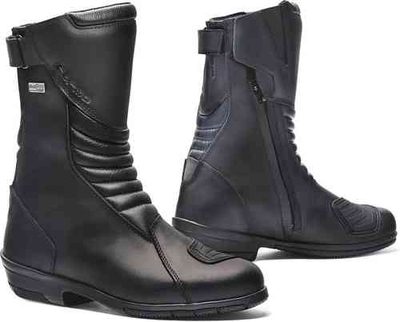 Buitenste Volnerf leder bovenste Specifieke dame/touring samengestelde middellange hiel rubber enige Gepersonaliseerde plastic versnelling pad bescherming Gevoerde kraag op voorste manchet voor extra comfort Elastisch kant en achterste panelen voor betere montage Velcro en rits sluiting Achterzijde Velcro voor kalf aanpassing Achterzijde reflecterende invoegen Innerlijke Out Dry® waterdicht en ademend membraan, 3D gelamineerd rechtstreeks aan de bovenste Scheenbeen en enkel TPU gegoten kunststof bescherming Zachte polymeer opvulling met traagschuim PP Mid Dual Flex met anti-schok voelde tussenzool Anti-bacteriële vervangbare voetbed met A.P.S. (Air pompsysteem) en gepersonaliseerde microfiber bekleding