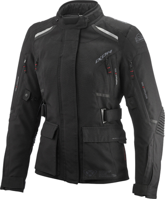 * Ventilatie: 2 ritsen op de rug, 2 ritsen op de biceps, 2 ritsen op de borst * Zakken: 2 voorzakken, 2 zijzakken met riemen voor passagiers, 1 okselzak, 1 binnenzak, 1 binnenzak van gaas, 1 waterdichte zak, 1 zak met thermische voering * Overig: Reflecterende stickers, uitneembare thermovoering artikel: Ixon Midgard Waterdichte dames motorfiets textiel jas, zwart, afmeting XL voor vrouw