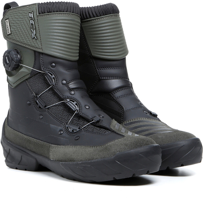 * Suède, technische stof en synthetische materialen. * Middenvoet met hitteschild * Reflecterende inzetstukken voor hoge zichtbaarheid artikel: TCX Infinity 3 Mid WP Motorlaarzen, zwart-groen, afmeting 38