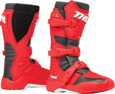 * Mesh voering verbetert de luchtstroom * Unidirectionele buitenzool met een inzetstuk van stalen schacht * Spuitgegoten mediale slijtplaat met geĆ ntegreerde schakelbeveiliging artikel: Thor Blitz XR MX Jeugd Motorcross Laarzen, zwart-rood, afmeting 32 33