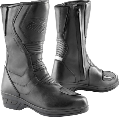 Functies 6 cm verhoogde binnenzool en buitenzool, teen versterking, hielversterking, enkelbescherming, tandwielhendelversterking, zijritssluiting met deksel, comfortbekleding, individueel verstelbare kuitbreedte door klittenband en elastisch wisselplaat, reflecterende elementen. Materiaal PU gecoate leer in een matte look, ademende netto binnenvoering. Membran Membran Hipora® 3-laags klimaatmembraan, waterdicht en winddicht, ademend. Hoogte van bootpoot ca. 29 cm (maat 44). Enige binnen en buiten verhoogde, snijbestendige zool, olie- en benzinebestendig.