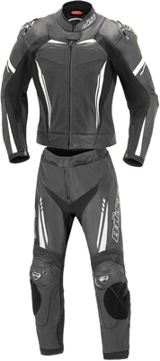 Functies Harde schelpen met metalen inzetstukken op schouders, ellebogen en knieën verwijderbare en aerodynamisch gevormde rugbult comfortkraag met neopreen voltooiing sportiv montage met ergonomische snit leer strekken zich uit over schouders, ellebogen, billen en knieën elastisch comfort insets bij schouder, crook van arm, cleat, hol van knie en kuit die de mobiliteit verbeteren verbindingsrits knieslider patch kuitbreedte aanpassing door een tweede rits 1 binnenzak Veiligheid SAS-TEC beschermers op de schouders, ellebogen, heupen en knieën Retrofittable SAS-TEC rugbeschermer veiligheidsnaden volgens ISO 4916 verdubbeld materiaal op de billen reflecterende elementen Materiaal robuust 1, 2 tot 1, 4 mm dik koeienleer gecombineerd met elastisch polyamideweefsel ademende mesh voering met elastische inserts Overzicht rugbeschermers