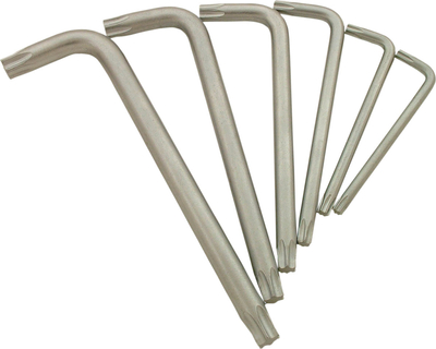 Ontworpen voor Europese motorfietsen met torx-bevestigingen bevat deze set T20, T25, T40, T45, en T50 maten. Gemaakt van een hittebehandelde chroom vanadium legering met precisie tips, en vernikkeld.