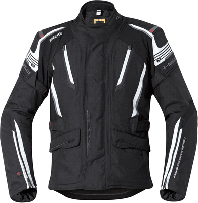 Buitenkant GORE-TEX® Pro Textil Laminaat Lining Afneembare thermische bodywarmer COOLMAX® ademende mesh binnenvoering 3D air mesh panelen in de rug om de luchtcirculatie te bevorderen Membraan GORE-TEX® Pro Fit/features Waterdichte buitenzakken 7 binnenzakken Intern zakje voor mobiele telefoon Voorkant met ventilatieopeningen Armverstelling Verstelbare tailleband Heupverstelling Zachte kraag Doorlopende rugprotector kan worden geà ntegreerd in de voering van het jack Stretch panelen op binnenarmen Bescherming Exclusieve EN 1621-1 Held klaverblad SAS-TEC schouder & elleboogbeschermers TEMPERFOAM® rugbeschermer Optionele EN 1621-2 rugbeschermer Aansluitende ritssluiting 3M SCOTCHLITE™reflectoren ...