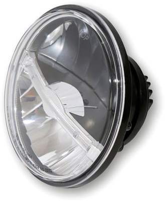 HIGHSIDER LED-hoofdlamp-inzetstuk JACKSON, 5 3/4 inch. Deze ronde, verchroomde reflector heeft grootlicht, dimlicht, parkeerlicht en een helder glas. De parkeerlichtfunctie wordt in het midden van het inzetstuk weergegeven als een lichtbalk (Light Guide System). De reflector straalt een asymmetrische
