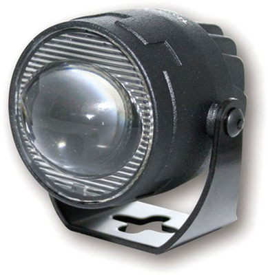HIGHSIDER SATELLITE LED dimlicht met beugel, E-keurmerk. Kleine, krachtige dimlichtkoplamp met 2 power LED s (elk 8 watt) in een matzwarte aluminium behuizing met ronde lens, ingesloten in een stevige stalen beugel. De LED-technologie en het gebruikte inzetstuk produceren een symmetrisch, helder licht voor optimale waarneming van motorrijders door andere weggebruikers. Zie en word gezien