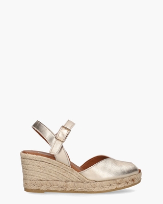 Damesespadrilles 2008 van het Spaanse merk Viguera. Deze peeptoe-stijl is vervaardigd met een bovenwerk van goudkleurig gestructureerd leer, terwijl het voetbed is vervaardigd van zacht leer voor optimaal comfort. Op de 7 cm hoge wedge van touw loop je uiterst comfortabel. De onderzool is gemaakt van rubber voor een stevige grip, terwijl het lederen enkelbandje verstelbaar is via een gespje voor een perfecte pasvorm. Kleur: goud.