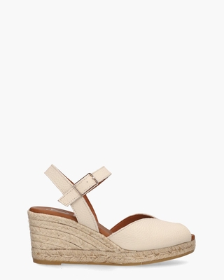 Espadrilles voor dames 2008 van het Spaanse merk Viguera. Dit peeptoe model heeft een upper van roomwit gestructureerd leer. Het voetbed is van zacht leer gemaakt. Op de 7 cm hoge wedge van touw loop je heel comfortabel. De onderzool is in rubber uitgevoerd en het lederen enkelbandje is door middel van het gespje verstelbaar. Kleur: roomwit. (Vanilla)