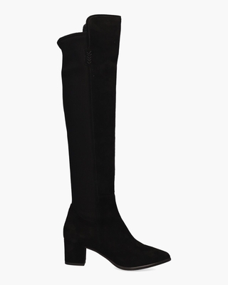 Lange laarzen voor dames 20E194 van het Italiaanse merk Marcos Nalini. Dit model op een afgeronde carréleest is aan de voorkant van suède gemaakt en is aan de achterzijde in stretchstof uitgevoerd. De binnenkant is in leer en stof met een vast voetbed uitgevoerd. De schacht heeft een hoogte van ongeveer 49, 5 cm en is vooraan iets hoger. De laarzen hebben geen ritssluiting. De stevige blokhak is circa 6 cm hoog. De zool is van rubber gemaakt. Een zilveren sierbutton maakt de boots af. Kleur: zwart. (Nero) ...