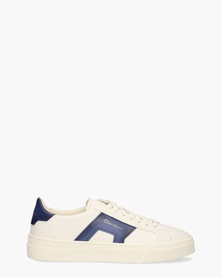 Sneakers voor heren 21779 van het merk Santoni. Deze handgemaakte herenschoenen zijn in wit leer uitgevoerd. De bewerking opzij en op de hielcap in blauw handgepoetst leer geeft dit model een unieke look. De binnenkant is in soepel kalfsleder uitgevoerd. Witte veters, golden branding en rubberen cupzool met merkopdruk en maxi oranje Santoni-logo aan de onderkant maken de sneakers compleet. Bovendien zijn de schoenen voorzien van een uitneembaar voetbed. Kleur: wit/blauw.  (White/ Blue) Schoenen van het merk Santoni vallen over het algemeen iets ruimer uit maar zijn vaak gemaakt op een smallere leest.