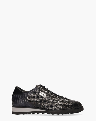 Een perfecte mix van elegantie en sportiviteit. Deze herensneaker 2817 uit de collectie van het Italiaanse merk Harris is een echte blikvanger. De upper van zwart leer combineert een grof en fijn crocomotief met gevlochten leren details op de zijkanten, wat het ontwerp verfijnd en uniek maakt. De voering en het uitneembare voetbed zijn uitgevoerd in luxe leer en suède, wat zorgt voor comfort en een hoogwaardige afwerking. Opvallende zilveren vierkante veteroogjes en het bijpassende zilverkleurige Harris-logo geven de sneaker een chique uitstraling. De zwarte/grijze rubberen zool met een grof kartelprofiel biedt stevige grip en een stoere touch. Deze sneaker draag je met gemak zowel casual als in een geklede outfit. Kleur: zwart. (Nero) De ontwerpen van Harris vallen over het algemeen ruimer uit.