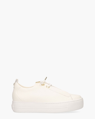 De damessneakers 5017-007 van het Duitse merk Paul Green combineren sportiviteit met verfijnde details. Gemaakt van wit zacht kalfsleer hebben deze sneakers een luxe uitstraling. De gouden accenten, zoals de veteroogjes, vetertips, logo-opdruk op de tong en de merkbutton op het hiellusje, geven de schoenen een elegante touch. De voering bestaat uit een combinatie van leer en textiel, en het vaste voetbed is uitgevoerd in supersoft leer voor extra comfort. De witte plateauzool van 3, 5 cm is licht en flexibel, terwijl de elastische vetersluiting zorgt voor gemakkelijk aan- en uittrekken. De initialen van Paul Green op de achterkant van de zool maken het ontwerp compleet. Kleur: wit. (White) ...