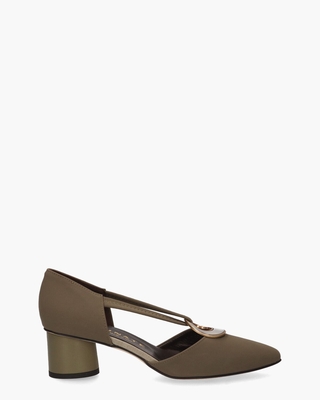 Opengewerkte pumps voor dames 50819 van het merk Brunate. Deze damesschoen heeft een upper van zachte stof in een olijfgroene tint. De binnenkant is in leer uitgevoerd en voorzien van een vast voetbed. Bijzonder is de gouden en zilveren ringapplicatie met stretchbandjes op de wreef. De ronde hak heeft een hoogte van ongeveer 5 cm. De leest is spits toelopend. Kleur: groen. (Bush)