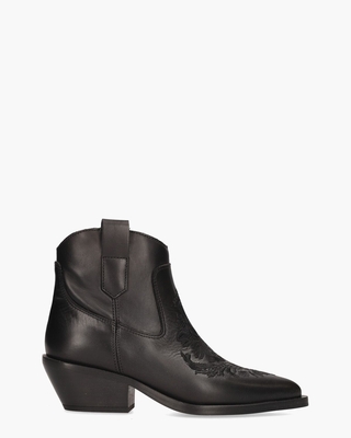 Deze dames westernstyle enkelboots 5252 van het Spaanse merk Alpe brengen een stijlvolle en comfortabele toevoeging aan je garderobe. Met hun zwarte lederen afwerking en opvallende cowboystitching en borduursels, stralen ze een tijdloze westerncharme uit. De schacht, met een hoogte van ongeveer 11, 5 cm, is voorzien van een ritssluiting die zorgt voor gemakkelijk aan- en uittrekken. De binnenkant is gevoerd met zacht textiel, wat zorgt voor een aangenaam draaggevoel. De zwarte sierlussen en de 4, 5 cm hoge schuine hak maken het geheel af en geven de laarzen een subtiele, elegante lift. Een ideale keuze om je casual look een stijlvolle twist te geven. Kleur: zwart.