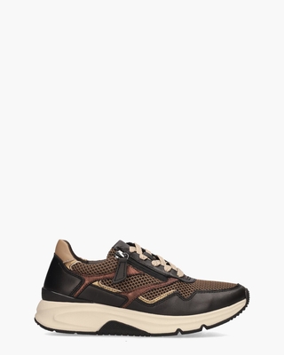 De Rolling Soft 56.896.43 sneakers voor dames van het merk Gabor staan voor stijl en comfort. Deze schoen is gemaakt van leer en mesh in zwart, beige, metallics en bruin. De binnenkant met uitneembaar voetbed is in leer uitgevoerd. De off-white/zwarte rubberen 3, 5 cm hoge zool heeft een fijn kartelprofiel zodat je goede grip hebt. De beige/zwarte veters en het handige ritsje zorgen voor een perfecte pasvorm. Kleur: multi.