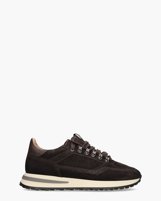 De herensneakers 57892 van het merk Giorgio1958 stralen stijl en stoerheid uit met hun upper van donkerbruin  geschuurd suède. De hielcap is uitgevoerd in bijpassend grijs leer voor een elegante afwerking. De binnenkant van de schoenen is volledig van leer en biedt, samen met het comfortabele uitneembare voetbed, ultiem draagcomfort. De dubbele tong en metalen veterhaakjes geven de sneakers een robuuste uitstraling en de driekleurige rubberen zool met grof profiel zorgt voor een stevige grip. De gewatteerde enkelkraag voegt extra comfort toe, terwijl de donkerbruine veters en het merklogo op de tong het geheel stijlvol afronden. Kleur: donkerbruin.
