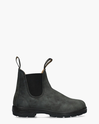 Een klassieker met een stoere twist: de Blundstone 587 Chelseaboots voor dames hebben een donkergrijs nubuck bovenwerk. De laarzen krijgen extra karakter door de oversized merklabels en elastische zijpanelen. De binnenzijde is gevoerd met leer en stof en bevat een uitneembaar voetbed voor langdurig comfort. De robuuste rubberen zool met profiel en 3 cm hak biedt grip en stabiliteit, zelfs op ruiger terrein. Combineer met een utility pants en een gewatteerde jas voor een eigentijdse, outdoor-ready outfit. Kleur: donkergrijs. (Rustic Black)