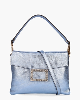 H&- of schoudertas 590 van het Italiaanse merk Carol J. by Gianni Notaro. Deze bag is gemaakt van metallic lichtblauw gestructureerd leer met een schitterende zilveren strassapplicatie op de voorkant. Aan de stoffen binnenzijde is de tas uitgerust met 2 compartimenten en een ritsvakje. Beide hengsels zijn afneembaar. De schouderband is in lengte verstelbaar en de tas sluit met een magneetje onder de flap. Gouden hardware maakt dit model compleet. Afmetingen: hoogte: 16 cm breedte: 21 cm diepte: 5 cm. Kleur: lichtblauw. (Celeste)