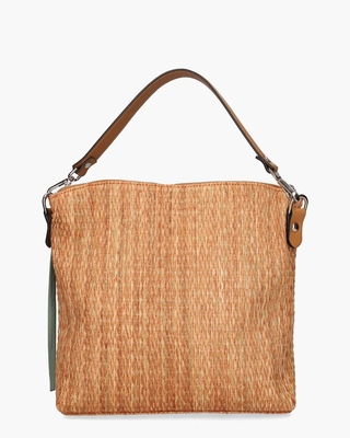 Shopper 618 van het Italiaanse tassenmerk Carol J. by Gianni Notaro. Dit model is gemaakt van geweven raffia in een oranje tint. Het afneembare hengsel is in cognackleurig leer uitgevoerd. Aan de binnenkant heeft de bag een rits- en steekvak. De tas sluit met een rits aan de bovenzijde en heeft een extra ritsvak aan de achterkant. Zilverkleurige hardware en leren tassels in oranje en zeegroen geven de tas extra flair. Afmetingen: hoogte: 27 cm breedte: 29 cm diepte: 9, 5 cm. Kleur: oranje/multi. (Coralo)
