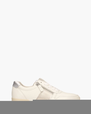 Deze 63.420.22 damessneakers van Gabor stralen luxe uit. Het gebroken witte leer wordt verfijnd afgewerkt met goudkleurige leren details op de zijkant, een zilveren accent op de tong en een zilverkleurige hielcap. De combinatie van een stoffen en leren voering en een uitneembaar voetbed zorgt voor een comfortabel gevoel bij elke stap. Praktische ritsjes maken het aan- en uittrekken eenvoudig. De witte en beige rubberen zool met een licht kartelprofiel biedt grip en stabiliteit. Het iets bredere loopvlak van de F-leest geeft extra ondersteuning. Witte veters en een beige rubberen stabilizer maken het stijlvolle ontwerp compleet.  Kleur: off-white. (Latte)