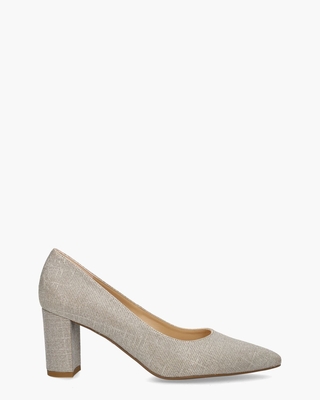 Damespumps, model 67501/049, uit de collectie van Peter Kaiser. Deze elegante schoen heeft een bovenwerk van beige/zandkleurig textiel met een subtiele glinstering. De binnenkant is volledig gevoerd met leer en voorzien van een suède hielversteviging voor ultiem comfort. Met een blokhak van ongeveer 7 cm hoog en een spitse neus straalt dit model extra vrouwelijkheid uit. Kleur: zand/beige/zilver. (Sand/ Shimmer)
