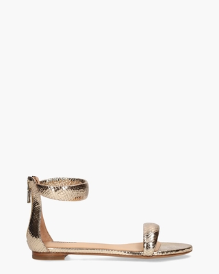 Sandalen voor dames Amy 153Z51BK uit de collectie van het Spaanse merk Lola Cruz. Dit elegante modelletje heeft een upper van goudkleurig leer met een slangenprint. Zowel het wreef- als het enkelbandje zijn in gepolsterd leer uitgevoerd. De voering en het zachte voetbed zijn ook van leer gemaakt. De sandaaltjes sluiten met een rits aan de achterkant. Het hakje is circa 1, 5 cm hoog en heeft een rubberen inzet. De loopzool is van leer gemaakt. Kleur: goud. (Platino)