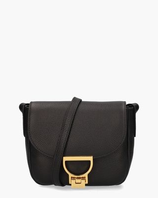 H&- of schoudertas Arlettis Medium van het Italiaanse merk Coccinelle. Deze tas met gouden logo-buckle is gemaakt van zwart grain leer. De tas beschikt aan de stoffen binnenzijde over 2 compartimenten afsluitbaar met een rits en drukker.  Ook heeft de tas nog een steekvak binnenin en een extra voorvak. De meegeleverde schouderband is verstelbaar. Hierdoor kan de tas ook crossbody worden gedragen. Goudkleurige hardware en een gouden merklogo achterop maken de bag compleet. Afmetingen: hoogte: 19 cm breedte: 24 cm diepte: 14 cm. Kleur: zwart. (Noir) ...
