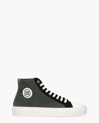 Sneakers voor heren Astro Hi 12C uit de collectie van Mason Garments. Dit luxe model, handgemaakt in Italië, heeft een bovenwerk van groen en zwart kalfssuède. De binnenzijde is in leer en mesh uitgevoerd en voorzien van een uitneembaar voetbed. Opvallend zijn het witte/zwarte MG merkembleem aan de zijkant en de lichtgrijze leren afwerking met silver 'M' bij de hiel. Een gevoerde kraag en tong en een witte rubberen 3, 5 cm zool met grof profiel dragen bij aan ultiem comfort. De toe cap is van rubber gemaakt. Witte katoenen veters, zilveren veteroogjes en vetertips, een gedrukt Mason Garments merkje op de tong en branding op de zool maken de luxe stijl compleet. Kleur: groen/zwart. (Green)