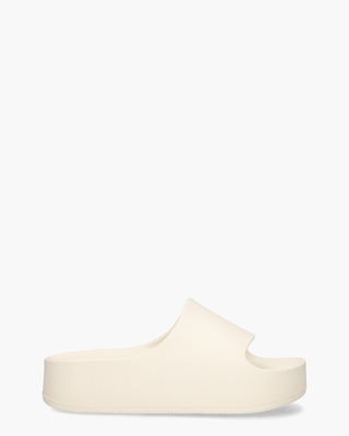 Slippers voor dames model Astro SM11002395-02002-253 uit de collectie van Steve Madden. Dit model is gemaakt van synthetisch materiaal in een gebroken witte tint. Het voetbed is voorgevormd en op de platformzool met een hoogte van 4, 5 cm loop je supercomfortabel. Kleur: off-white. (Bone)