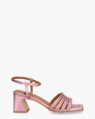 Sandalen voor dames Astro 23042 uit de collectie van het Spaanse merk Angel Alarcon. Dit carrémodel heeft een bovenwerk van leer in een metallic lichtroze tint. De binnenkant en het voetbed zijn ook in leer uitgevoerd. De bijzondere hak is circa 6 cm hoog. Het riempje rond de enkel is verstelbaar. Kleur: roze. (Rose)
