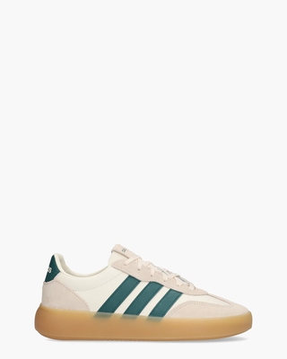 De perfecte balans tussen sport en lifestyle: deze Barreda Decode Lux JR1230 herensneaker combineert een hoogwaardig bovenwerk van off-white leer met zachte details in lichtbeige suède. De iconische drie strepen en het hielstuk zijn uitgevoerd in een diepe groene kleur van synthetisch leer, wat zorgt voor een krachtig contrast. De schoen is voorzien van branding op de tong en de hielcap, terwijl de gebroken witte veters het geheel harmonieus afstylen. Voor optimaal dagelijks comfort is de binnenzijde afgewerkt met een zachte voering van stof en beschikt de sneaker over een uitneembaar voetbed. De bulky rubberen zool biedt niet alleen uitstekende grip, maar geeft de schoen ook zijn karakteristieke, robuuste silhouet. Kleur: off-white/groen/lichtbeige. (Off-White/ Collegiate Green/ Wonder White) Stylingtip: draag deze sneaker onder een zandkleurige chino of een denim in lichte wassing met een losvallend shirt voor een frisse, moderne uitstraling. ...