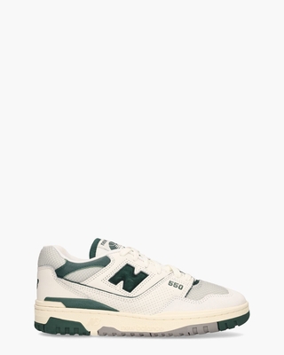 Deze New Balance '89 retro basketbalschoen model BB550CPE heeft een bovenwerk van leer, synthetisch materiaal, suède en mesh in de kleuren off-white, donkergroen en lichtgrijs. De iconische 'N' van New Balance prijkt op de zijkanten van de sneaker. Verder is de branding terug te vinden op de tong, het hielstuk en de zool. De binnenzijde, gemaakt van stof, heeft een uitneembaar Ortho Lite-voetbed voor extra demping. De driekleurige, slijtvaste rubberen buitenzool biedt ultiem comfort en duurzaamheid. Perforaties en katoenen veters in een roomwitte tint maken de herenschoenen af. Kleur: off-white/donkergroen. (Sea Salt/ March Green)