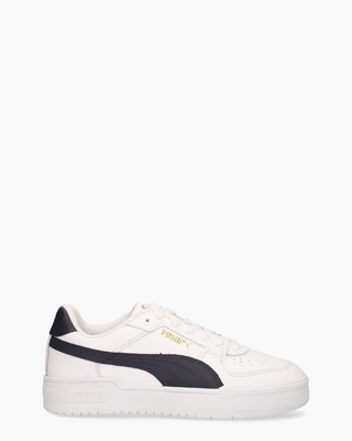 Sneakers voor heren CA Pro Classic 380190-18 uit de collectie van PUMA. Dit toffe model, een nieuwe uitvoering van de klassieke 80's PUMA California, heeft een bovenwerk van wit gerecycled leer. De binnenkant is in stof met een uitneembaar voetbed uitgevoerd. De sneakers vallen op door het donkerblauwe hielstuk en de bijpasende sidestripes, het cleane design en de perforaties op de neus. Golden branding is zichtbaar op de tong en ook aan de zijkant en op het hielstuk is een gouden merklogo geprint. De rubberen zool met PUMA-opdruk, stiksels en witte katoenen veters maken de coole classics compleet. Kleur: wit/donkerblauw. (PUMA White/New Navy)