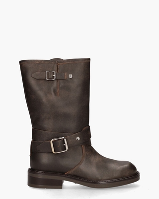 De Cameron A52113 boots in ¾-lengte van het Italiaanse merk Carmens stralen pure stoerheid uit. Deze motorstyle booties zijn vervaardigd van hoogwaardig kalfsleer met een unieke, very used poetsing, wat ze een robuuste uitstraling geeft. Binnenin zorgen de leren voering en het vaste voetbed voor een comfortabel draaggevoel. De zilverkleurige gespen en banden geven de laarzen een opvallende, edgy look, perfect voor een gedurfde stijl. De schachthoogte van circa 25 cm, gecombineerd met een rits aan de zijkant, zorgt voor een stevige pasvorm en makkelijk aantrekken. De sierstiksels en de latex zool met een hak van 2, 5 cm maken deze motorbike boots helemaal af. Kleur: donkerbruin. (Shadow Orzo)