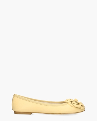 Deze handgemaakte ballerina van Odare model Carmen Fiori is een elegante keuze. Het bovenwerk van zacht leer in een lichtgele tint geeft de schoenen een zomerse look. De bloemapplicatie op de neus, ook in zachtgeel leer, zorgt voor een verfijnde uitstraling. De binnenkant is volledig van leer gemaakt en biedt een luxe draaggevoel. Het lage hakje van 1 cm, de stoffen afwerking en sierstiksels maken het klassieke ontwerp compleet. Kleur: lichtgeel. (Burro)