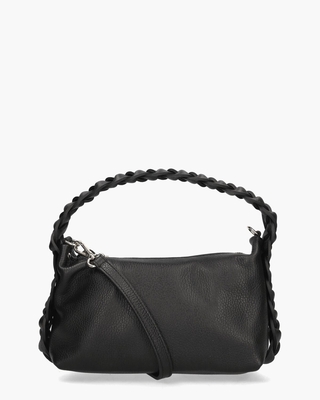 Zwarte tas Celia uit de collectie van Di Lauro. Dit model is gemaakt van gestructureerd leer. De zilveren hardware en details zoals het gevlochten hengsel geven de tas een bijzondere look. Aan de binnenkant bestaat de bag uit 1 compartiment met daarin een ritsvakje. De tas sluit met een rits aan de bovenzijde. Dankzij de afneembare schouderriem kun je de bag ook crossbody dragen. Afmetingen: hoogte 16 cm breedte 28 cm diepte 10 cm. Kleur: zwart.