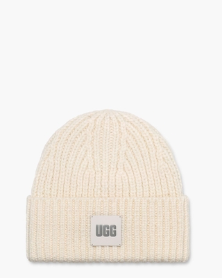 Grof gebreide geribbelde muts Chunky Rib Beanie 20061 van het label UGG. Dit unisex model is gemaakt van een warme wolmix. Op de brede omslag is een statement leren UGG-logo genaaid. Kleur: beige. (Nimbus) Onderhoud: • Alleen door gespecialiseerde stomerij laten reinigen.