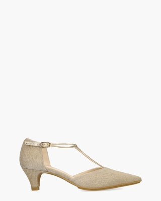 Chic én comfortabel – de Lodi Churro is de perfecte mix van glans, stijl en een klassieke touch. Het sprankelende goudkleurige textiel geeft je look direct een feestelijke upgrade. De verfijnde t-strap met verstelbaar enkelbandje zorgt voor een vrouwelijke en verfijnde uitstraling, terwijl de spitse neus het geheel modern houdt. Met de middelhoge 5, 5 cm hoge hak sta je stabiel én stijlvol. De leren voering en de zachte binnenzool met New Gel-demping bieden extra comfort. De rubberen onderzool geeft tot slot groede grip. Draag de pumps bij een elegante jumpsuit of als glinsterend accent onder een minimalistisch pak. Kleur: goud. (Oro)