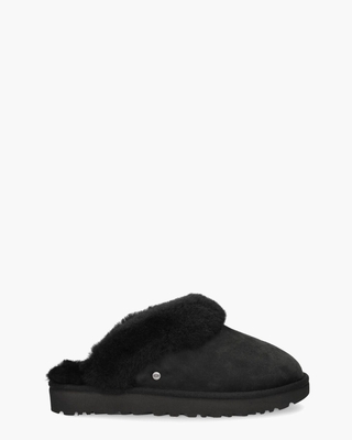 Pantoffels <i>Classic Slipper II 1130876</i> voor dames uit de UGG-collectie. Deze damespantoffels zijn gemaakt van zwart suède en zijn gevoerd met superzachte en