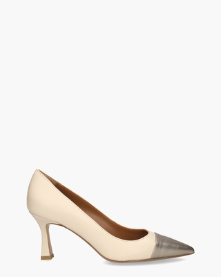 Pumps voor dames D806 uit de collectie van het merk Di Lauro. Dit model heeft een upper van leer in een gebroken witte tint. De binnenkant is ook in leer uitgevoerd. Het puntneusje in zilverkleurig leer geeft de schoenen een Chanel-achtige look. De smalle hak heeft een hoogte van circa 8 cm. Draag de pumps stoer onder een jeans of juist heel stijlvol onder een soepelvallende broek. Kleur: off-white/zilver. (Kiss)