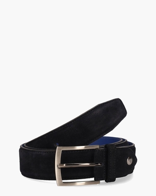 Stijlvolle riem De Belter 07.11/CFM-10018-41-01 voor heren uit de collectie van het Nederlandse merk Floris Van Bommel. Deze riem is uitgevoerd in donkerblauw suède. De binnenkant is van kobaltblauw glad leer gemaakt. De riem is 3, 5 cm breed. Een zilveren gesp en een subtiele metalen Floris Van Bommel-button maken de ceintuur af. Kleur: donkerblauw. (Dark Blue) Riemen van het merk Floris Van Bommel hebben een standaardlengte van 115 cm en zijn op maat te maken door middel van een schroefsysteem.