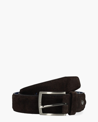 Tijdloos en verfijnd. De Floris van Bommel De Belter 07.19/CFM-10018-21-01 riem is uitgevoerd in donkerbruin suède en straalt pure klasse uit. De matte metalen gesp en het subtiele logo zorgen voor een stijlvolle, ingetogen look. Dankzij de leren voering voelt de riem stevig en comfortabel aan. Perfect bij zowel casual als formele outfits. Breedte: 3, 5 cm. Kleur: donkerbruin. (Dark Brown) Riemen van het merk Floris Van Bommel hebben een standaardlengte van 115 cm en zijn op maat te maken door middel van een schroefsysteem.