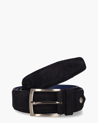 Klassieke donkerblauwe riem De Belter 15.72/CFM-10059-40-07 voor heren uit de collectie van het Nederlandse merk Floris van Bommel. Deze riem is vervaardigd van suède, met een blauwe leren voering aan de binnenkant. De riem is 3, 5 cm breed. De finishing touch wordt geleverd door een zilveren gesp en een subtiel metalen Floris van Bommel-button. Kleur: donkerblauw. (Dark Blue) De ideale match: deze FVB veterschoenen De Stapper 50.01 (). Riemen van het merk Floris Van Bommel hebben een standaardlengte van 115 cm en zijn op maat te maken door middel van een schroefsysteem.