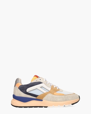 Deze herensneakers De Treener 01.10/SFM-10154-86-01 van Floris Van Bommel combineren moderne materialen met traditioneel vakmanschap. Het bovenwerk bestaat uit een mix van suède, leer, printleer en mesh in verschillende tinten zoals lichtgrijs, blauw, oranje, cognac, lichtblauw en Princess Peach. De leren voering met uitneembaar voetbed zorgt voor een comfortabele pasvorm. De multicolor rubberen runningzool met opvallend kartelprofiel biedt stabiliteit en optimaal loopgemak. Kenmerkende details, zoals de witte leren F opzij, het kleurrijke merkembleem op de tong en geborduurde branding op de hielcap, geven deze sneakers een herkenbare uitstraling. Witte/blauwe veters, kobalt rubberen stabilizer, oranje rubberen siernopjes en witte metalen eyelets maken het ontwerp op een normale  G½-leest compleet. Kleur: multi. (Orange) Floris Van Bommel schoenen vallen doorgaans iets ruimer.