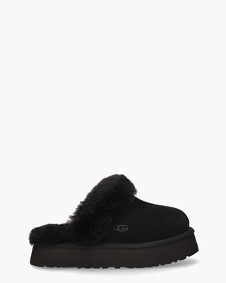 Pantoffels voor dames Disquette Slipper 1122550 van het lifestyle label UGG. Dit fluffy instapmodel heeft een bovenwerk van zwart suède. De kraag en de voering zijn gemaakt van warme en zachte schapenwol. De EVA-platformzool is ongeveer 3 cm hoog. Een UGG-logo opzij en een gestikte naad op de bovenkant maken dit cosy modelletje compleet. Kleur: zwart. (Black)