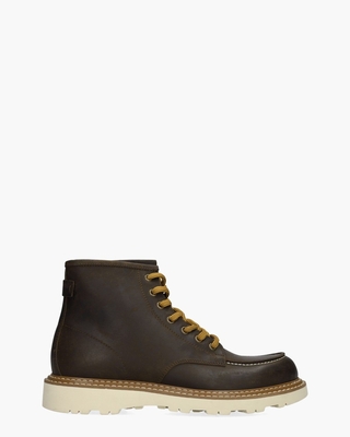 Met de Kebo DK7010 veterboots in donkerbruin leer kies je voor een robuuste stijl die toch verfijnd oogt. Het leren bovenwerk heeft een lichte vintage uitstraling en wordt krachtig aangezet door de gele veters en contrasterende stiksels. De rubberen profielzool geeft het model een moderne basis. Aan de achterkant van de 13 cm hoge schacht is een leren accent gestikt. Binnenin ervaar je een prettig draaggevoel dankzij de leren voering en het uitneembare voetbed. Draag deze boots met een zwarte tapered jeans en een trui met grove structuur of ga voor een streetstyle look met een jogger en een oversized hoodie. Kleur: donkerbruin. (Dakar Moro)
