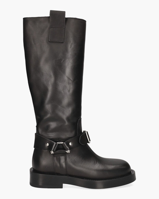 De Eloise 5296 lange laarzen voor dames van Alpe hebben een stoer motorstijlontwerp, gemaakt van zwart leer. De binnenkant is van stof gemaakt en is voorzien van een vast voetbed. Met zilverkleurige gespen, ringen en studs krijgen de boots een opvallende uitstraling. De stevige rubberen hak van ongeveer 3 cm versterkt de robuuste look. De schacht, die ongeveer 38 cm hoog is, is aan de bovenkant afgewerkt met leren sierlussen. Aan de zijkant heeft de laars een rits voor gemakkelijk aan- en uittrekken. Kleur: zwart. (Negro)